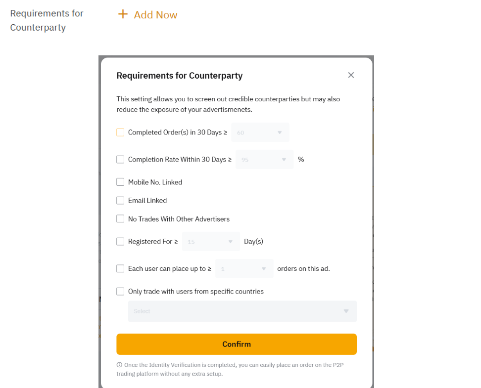 If you would like to set up requirements for your ad’s counterparty, click on Add Now and you will be prompted to select your preferred requirements.