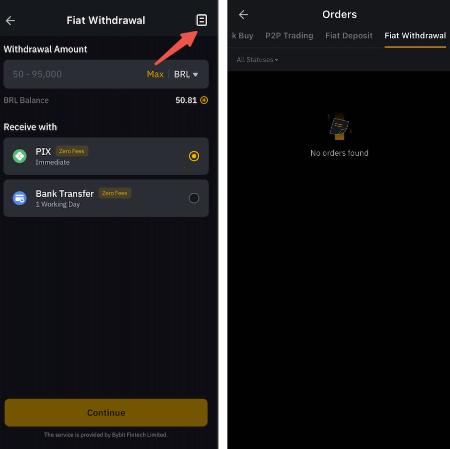 To view your withdrawal history, please tap on Orders in the upper right corner for more details.