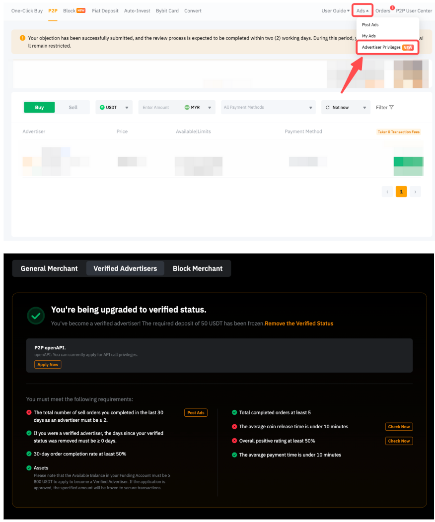 To become a Verified Advertiser or a Block Advertiser, you may check the respective requirements and apply to become one by visiting the P2P Advertiser Program page.