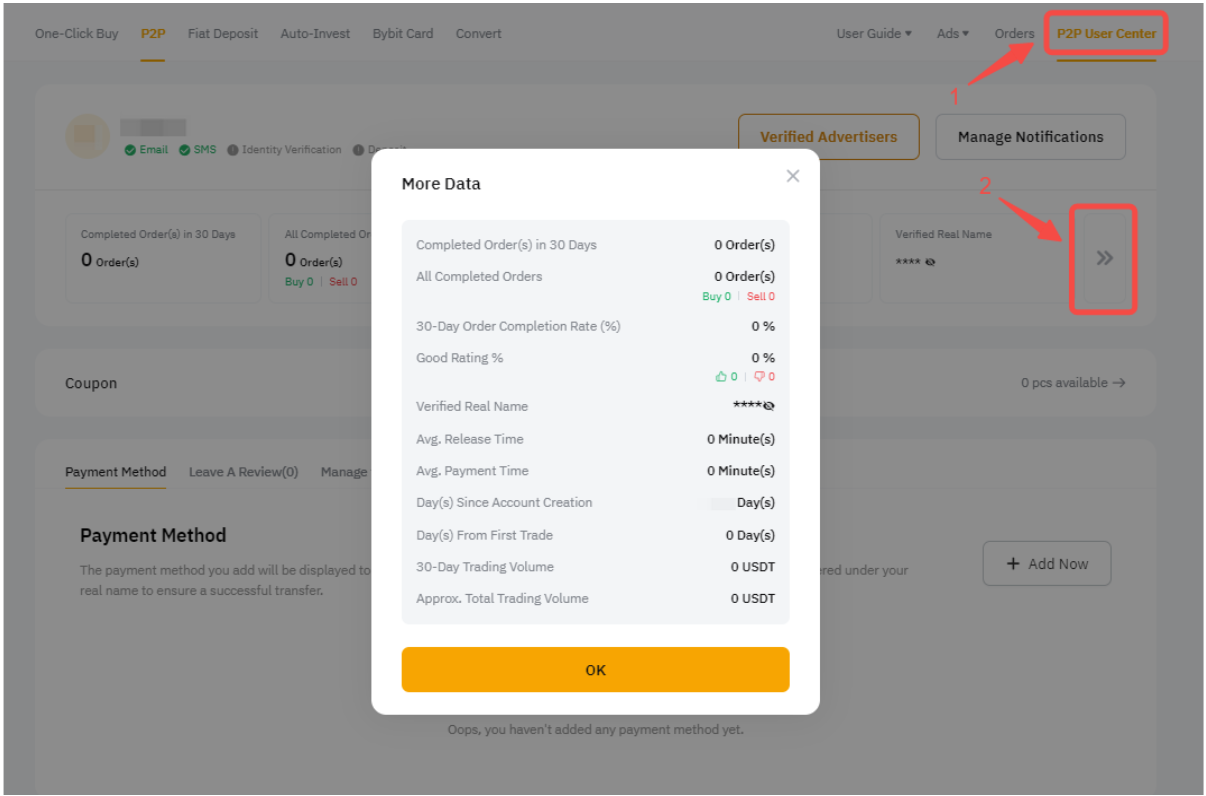 If you are on the app, please go to the P2P page and tap on the Profile icon to open the P2P User Center. There, tap on More data to display your P2P trading information.