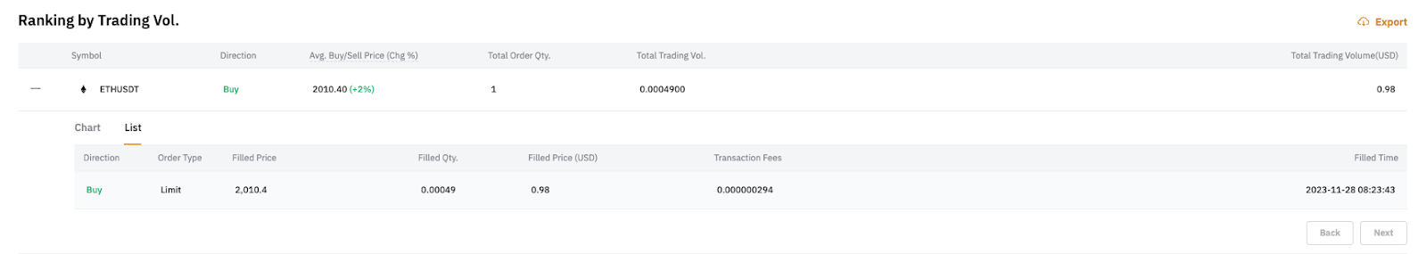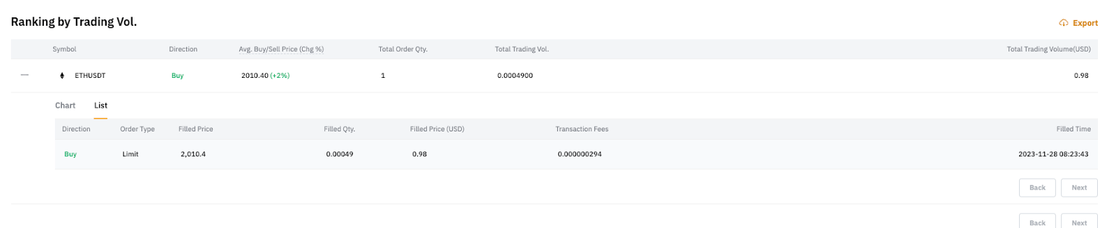 In the Ranking by Trading Vol tab, you can expand each symbol to view the Chart that shows your buy and sell points within the selected timeframe. Additionally, you can also select the time interval of the chart in the upper right corner and adjust the chart size.