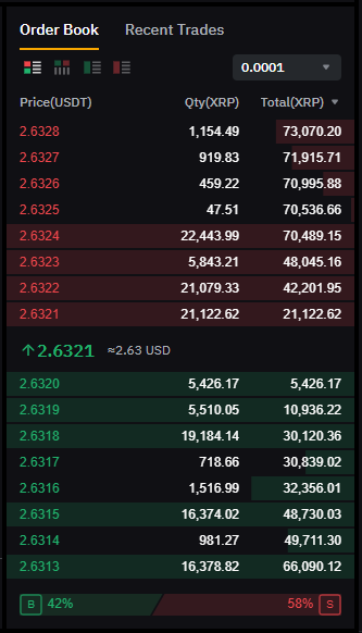 The Order Book shows the current market depth for the selected trading pair. The "Market Depth" refers to the ability of the market to keep prices unchanged when undertaking large transactions. The depth seen in the chart reflects the real-time outline of buyers and sellers’ orders awaiting execution at each price point.
