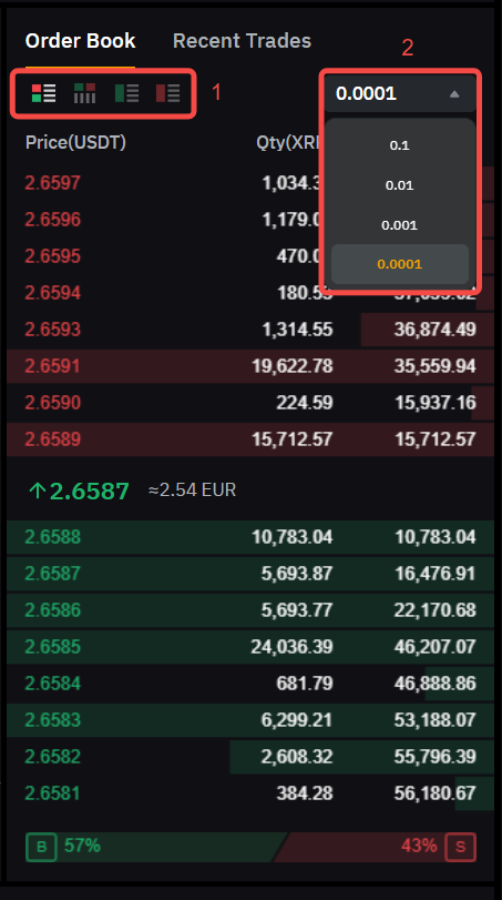 Only Sell orders displayed: Only the ask prices will be shown. In this setting, the last trading price will be visible at the bottom of the order book.