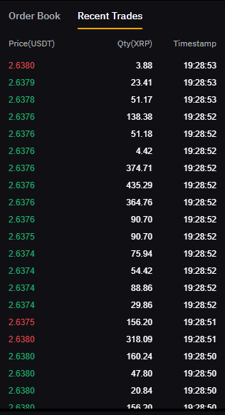 In the Recent Trades tab, you will see the latest executed orders in both directions as well as the order quantity and the timestamp: