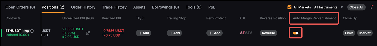 Go to the Trading page, locate your position in the Positions tab under the chart, and toggle the Auto-Margin Replenishment switch to enable or disable it.
