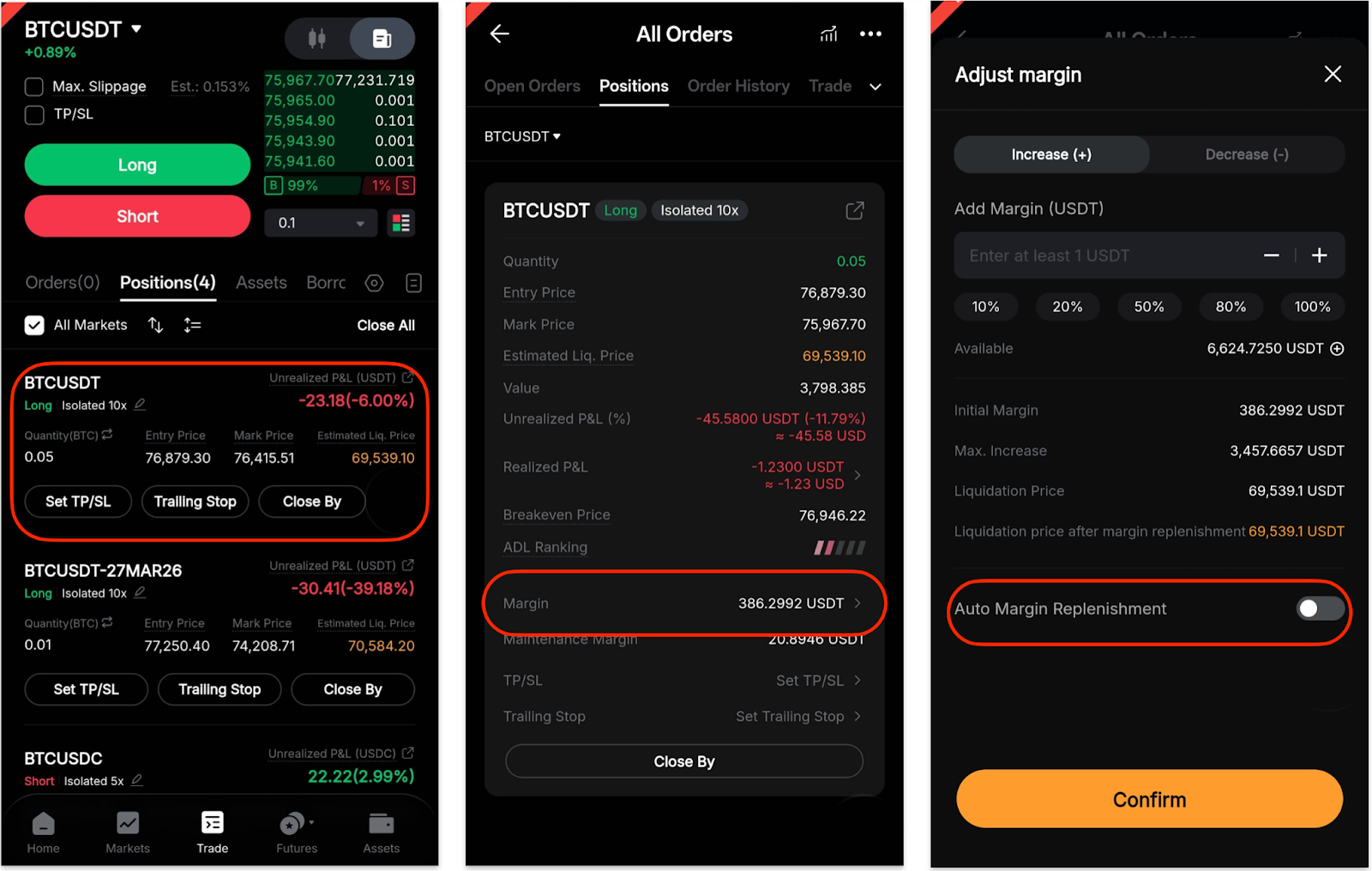Go to Trade, locate your position in the Positions tab under the order placement zone, tap the position, then tap Margin, and toggle the Auto-Margin Replenishment switch to enable or disable it.