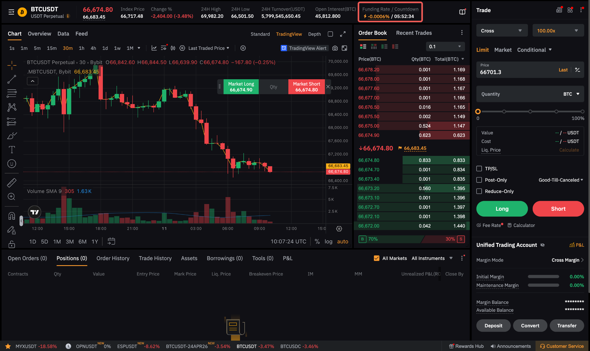 In order to anchor the Perpetual contract trading price to the Spot price, the funding mechanism is used to ensure Bybit’s last traded price is always anchored to global standard Spot prices. Here’s a brief overview of how it works: if the Perpetual market price sits above the Spot price (i.e., the funding rate is positive), long position holders will pay the funding fees to short position holders. This incentivizes traders to open more short positions and brings down trading prices, shifting toward the Spot price.
