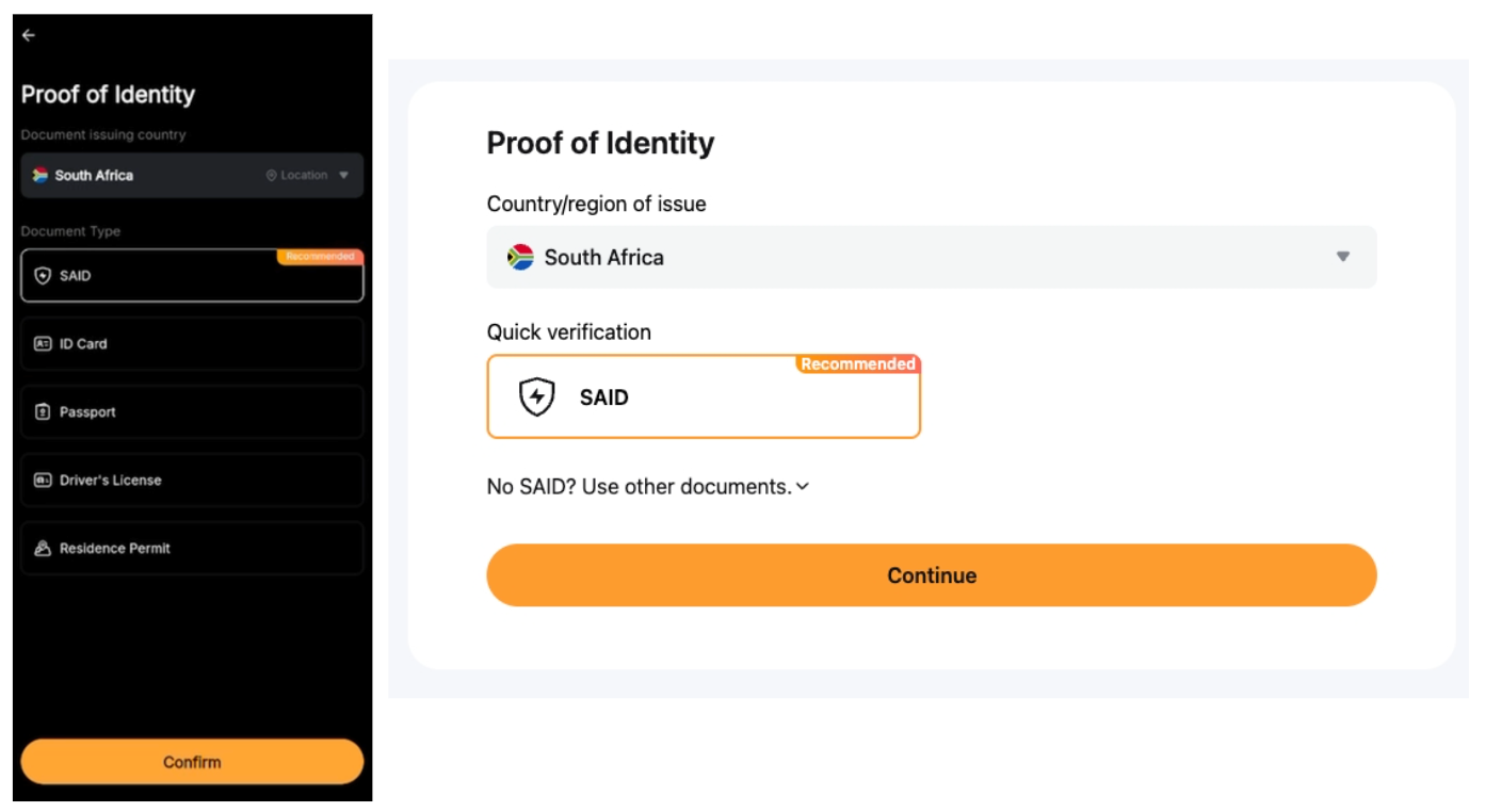 Residents of South Africa can complete identity verification using the local document type: SAID (South African ID).