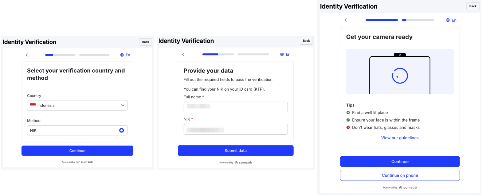 Residents of Indonesia can complete identity verification using the local document type: Nomor Induk Kependudukan (NIK).