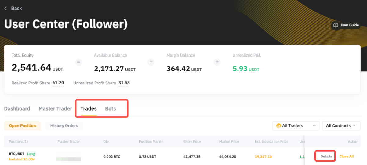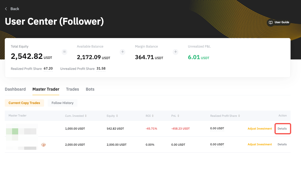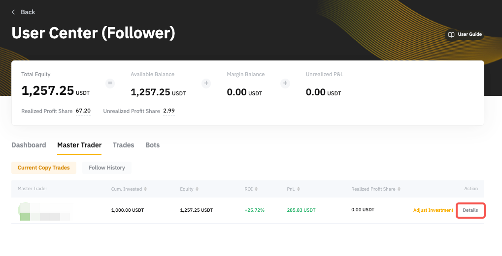 To cancel copying your Master Trader, go to User Center (Follower) → Master Trader → Current Copy Trades and click on the Details of the respective Master Trader you want to unfollow.