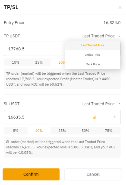 The percentage bar below the price refers to the ROI to be achieved. For example, Follower A has selected the 10% for Stop Loss and chose the Last Traded Price as the reference price. The system has automatically calculated $16,635.5 as the Stop Loss price. This means that when the Last Traded Price reaches $16,635.5, the SL order will be triggered and their ROI will be approximately -10%.