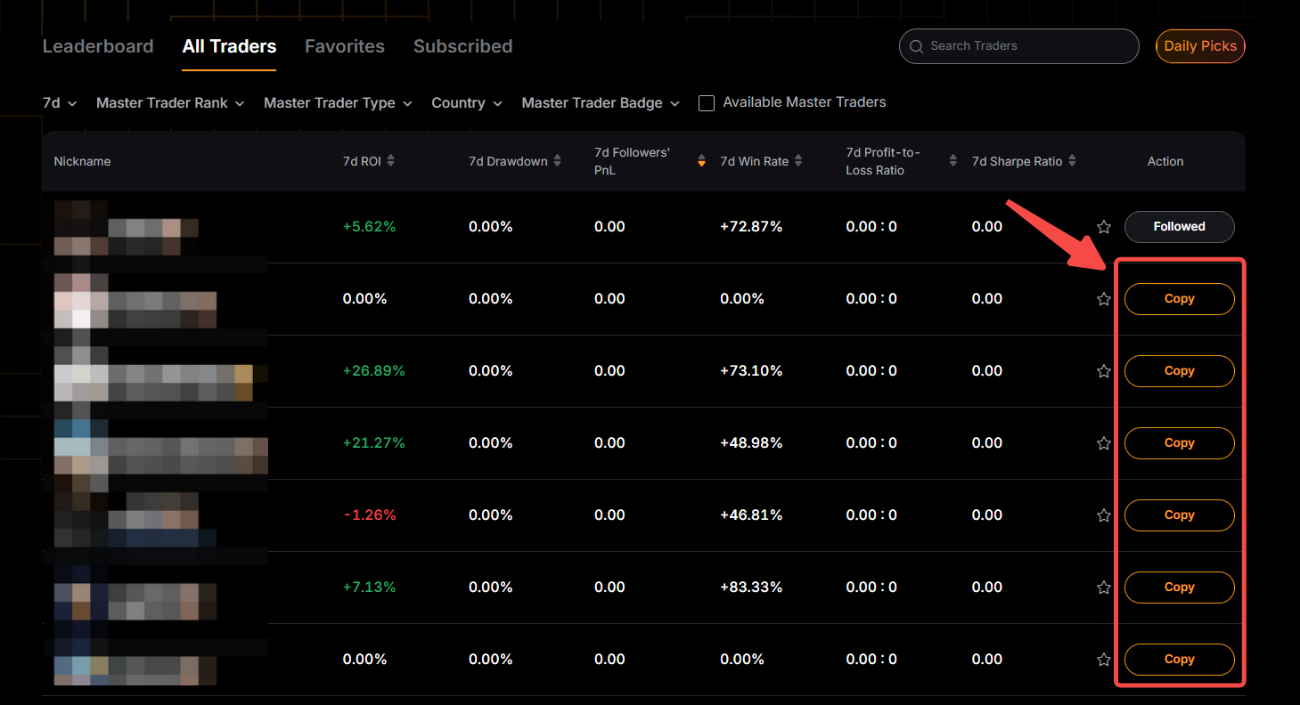 Step 2: Click on Copy at the bottom of the Master Trader’s card whom you want to follow to enter the Copy Trading Classic settings page. Followers can copy up to 10 Master Traders simultaneously.