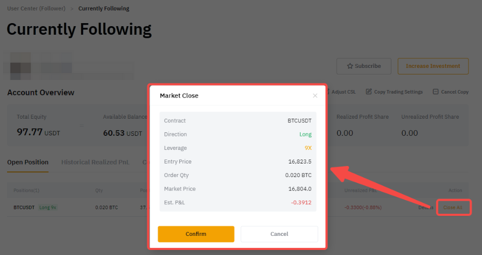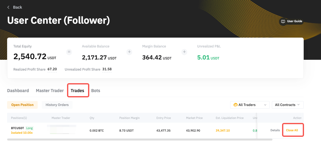 If you want to close the entire position under your Master Trader, please go to User Center (Follower) → Trades → Open Position → and click on Close All to close the entire position at market price.