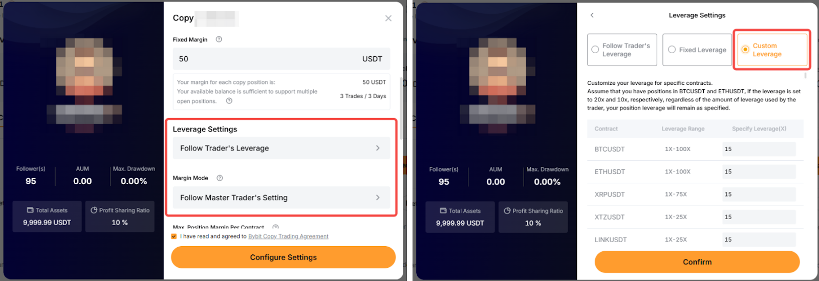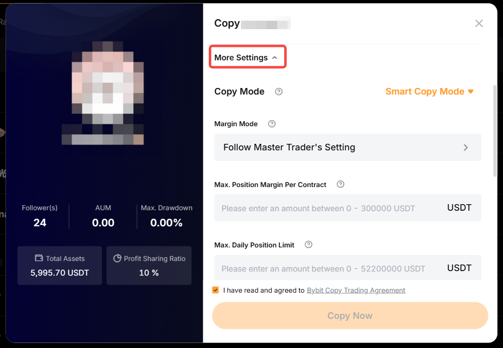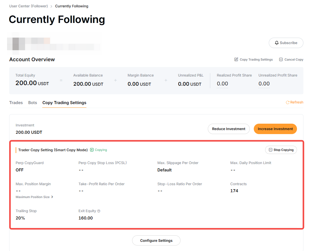 Margin Mode and Leverage Settings: To change the margin mode or leverage, you can refer to the steps above on how to edit your copy trade settings. Leverage change does not apply to Smart Copy mode as you will follow the Master Trader’s leverage.