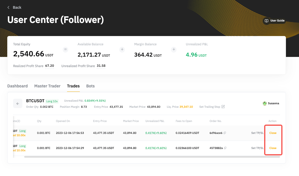 To close an order manually, go to User Center (Follower)→ Trades → Open Position → Details. You will see the order placed for that position and you can click on Close to close the respective order. The order will be exited via a Market Order.