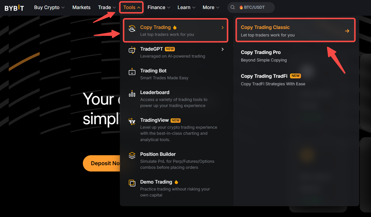 Step 1: Please click on Tools → Copy Trading in the navigation bar to enter the Copy Trading Classic page.