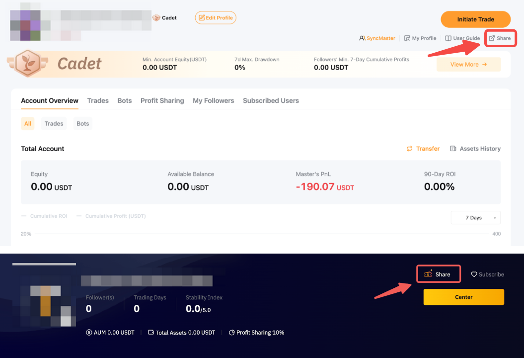 To share your profile, click on the Share button located at the upper right corner of your Trader's Center page. Alternatively, you can click on Share in your Master Trader Portfolio page.