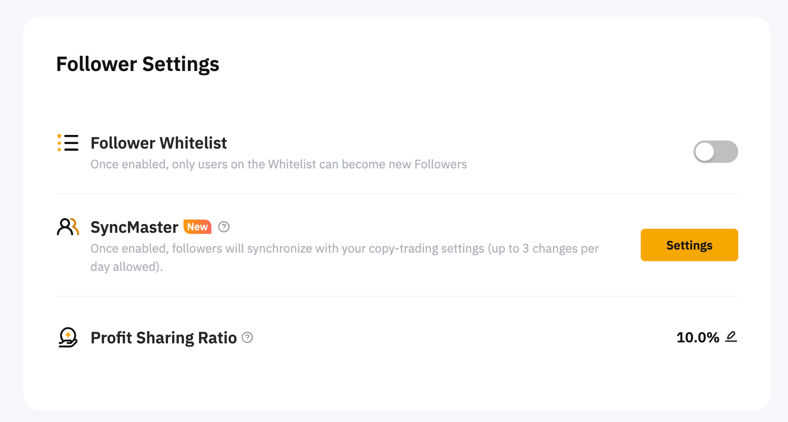 Under Follower Settings, you can manage your Follower Whitelist, SyncMaster, and Profit Sharing Ratio.
