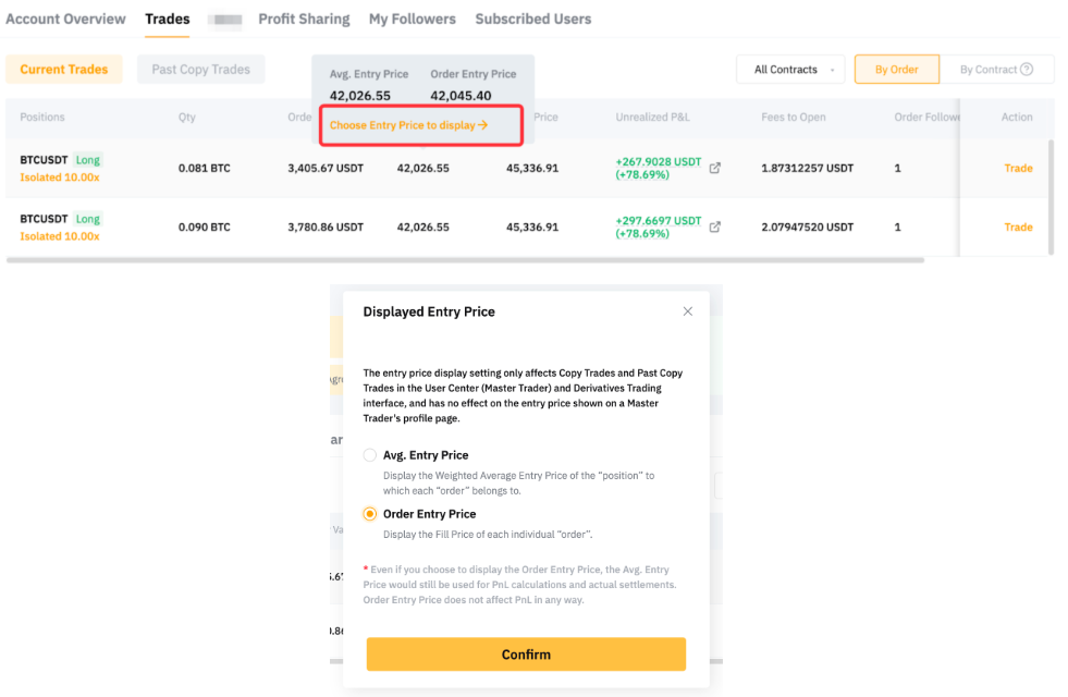 Please note that the Entry Price displayed in the order details is the position average entry price. To change the display to the order-filled price, you can move your cursor to the entry price and choose the Entry Price to display.