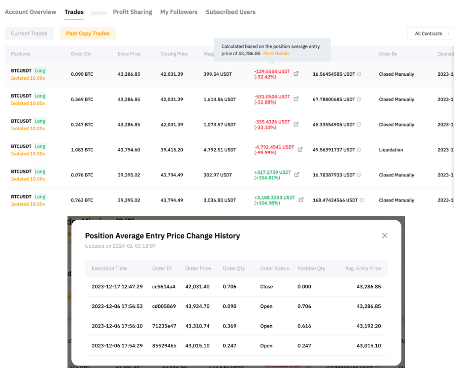 You can view the details of your closed positions here, including the closing time, the closing price, and Closed P&L, fees incurred, and more. The Closed P&L is calculated based on the position's average entry price. Move your cursor to the Closed P&L and click on More Details to view the Position Average Entry Price Change History.