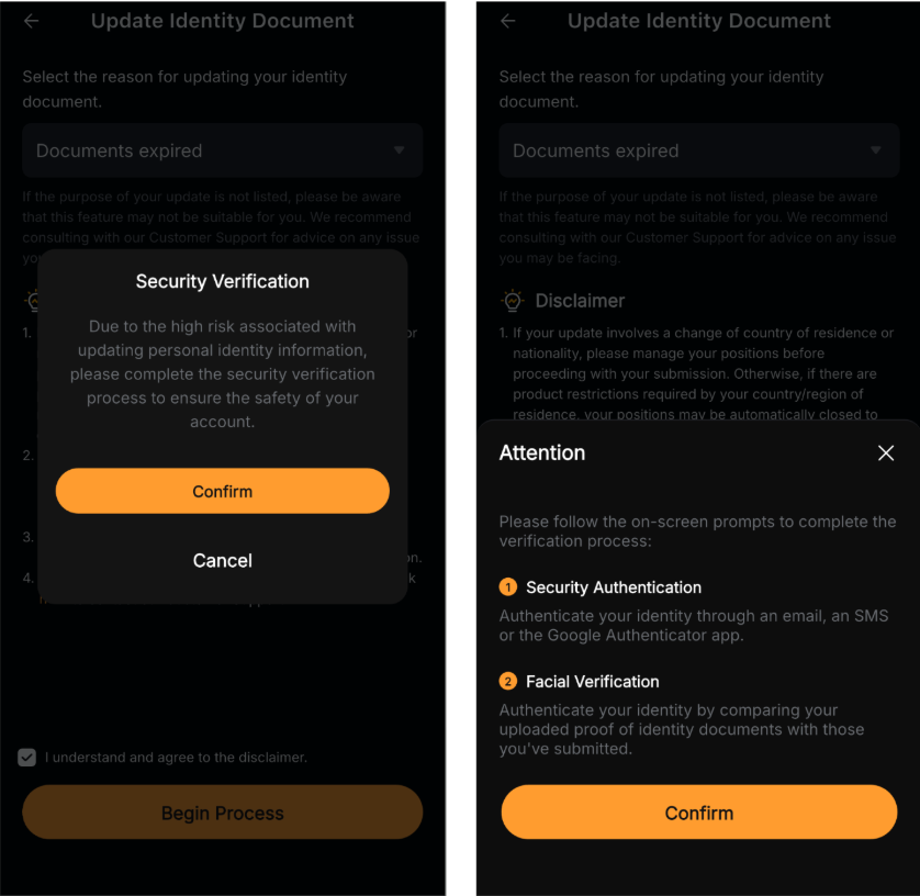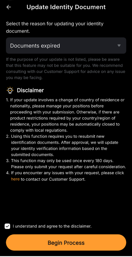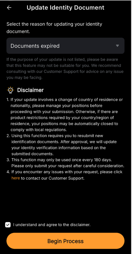 Step 3: Select the reason for updating your identity document. Read and acknowledge the disclaimer by ticking the checkbox, then tap Begin Process to proceed.