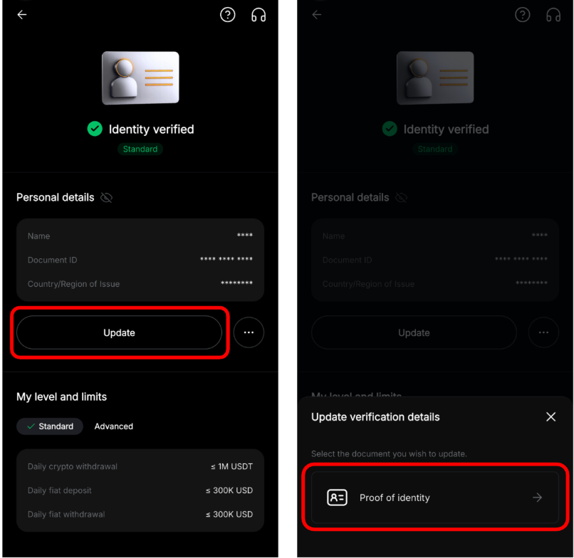 Step 1: Go to the Identity Verification page and tap Update → Proof of Address.