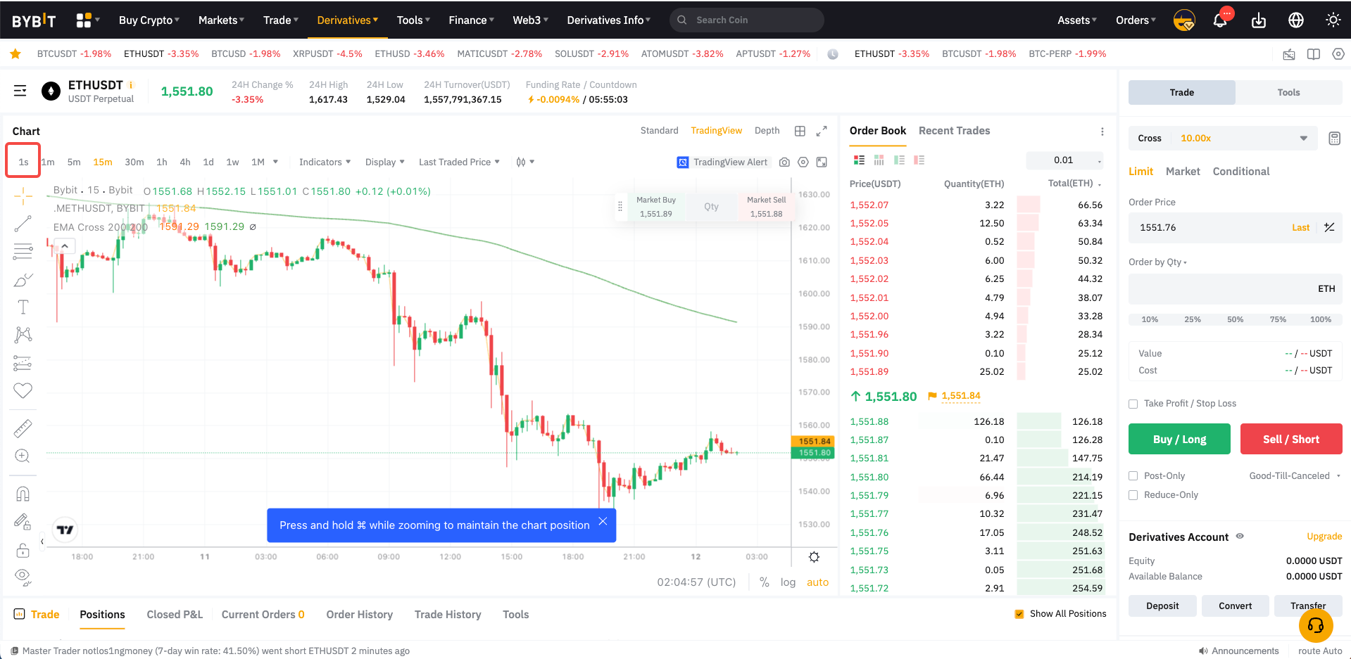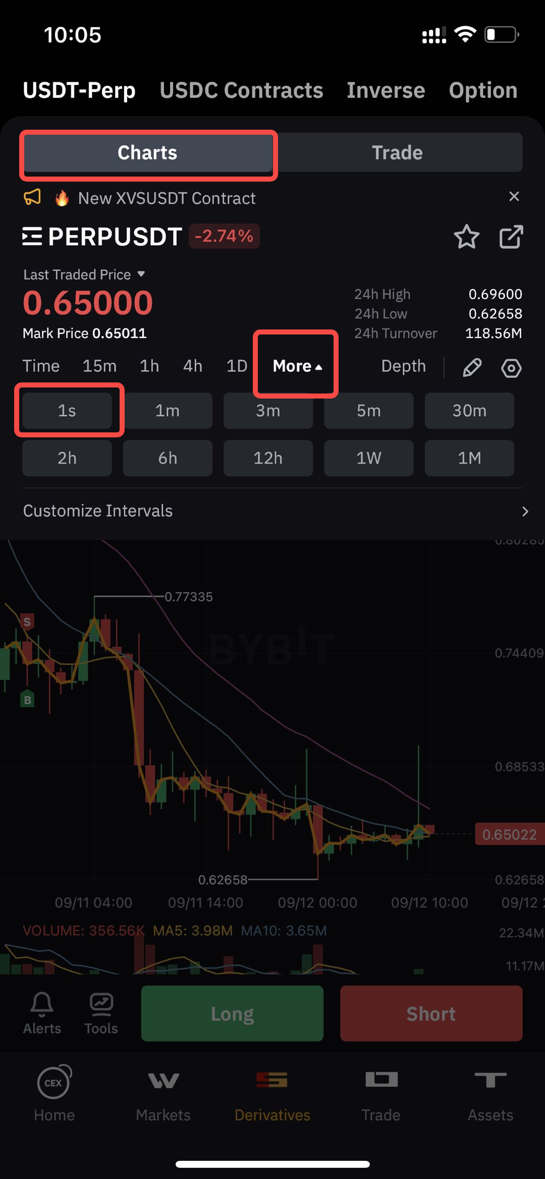 2. Click on the "1s" option just above the price chart (at the top left of the screen) to change the time interval to 1 second. If this option is not visible, click on "More" and then select the "1s" option.