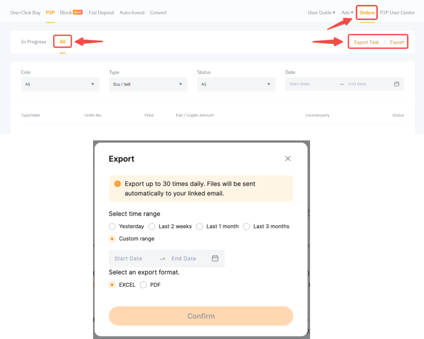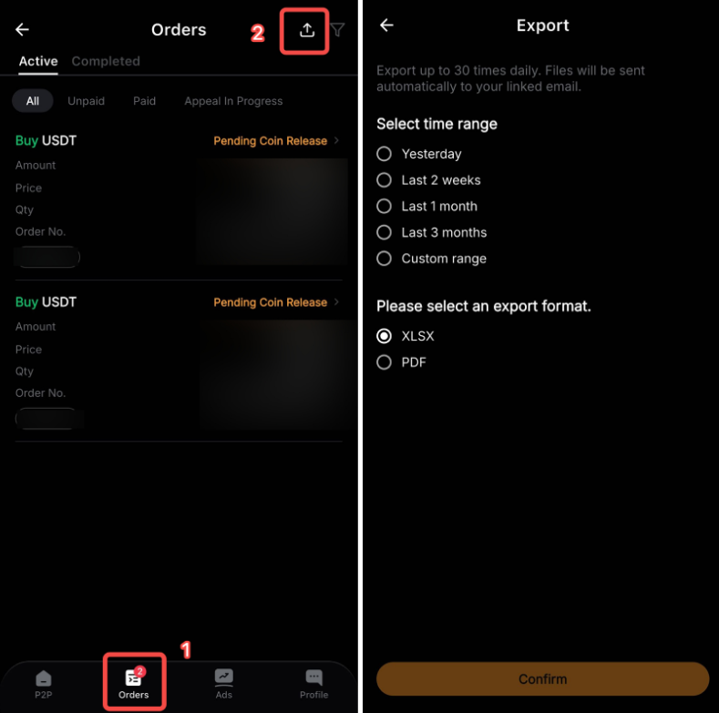 On the App, head to P2P Trading → Orders and tap on the Export icon. Then, select the export time range and format.