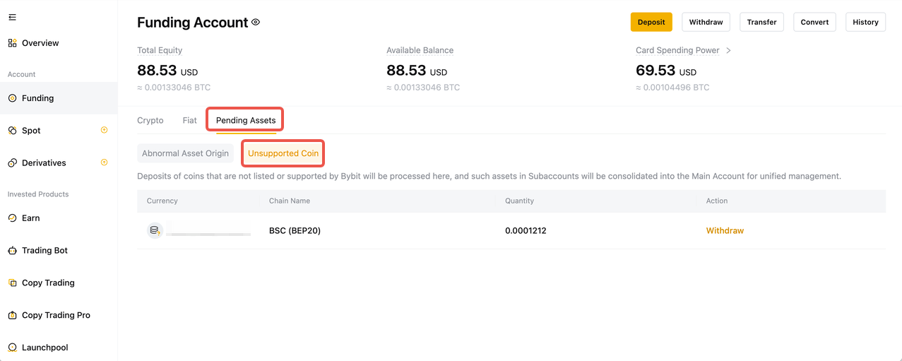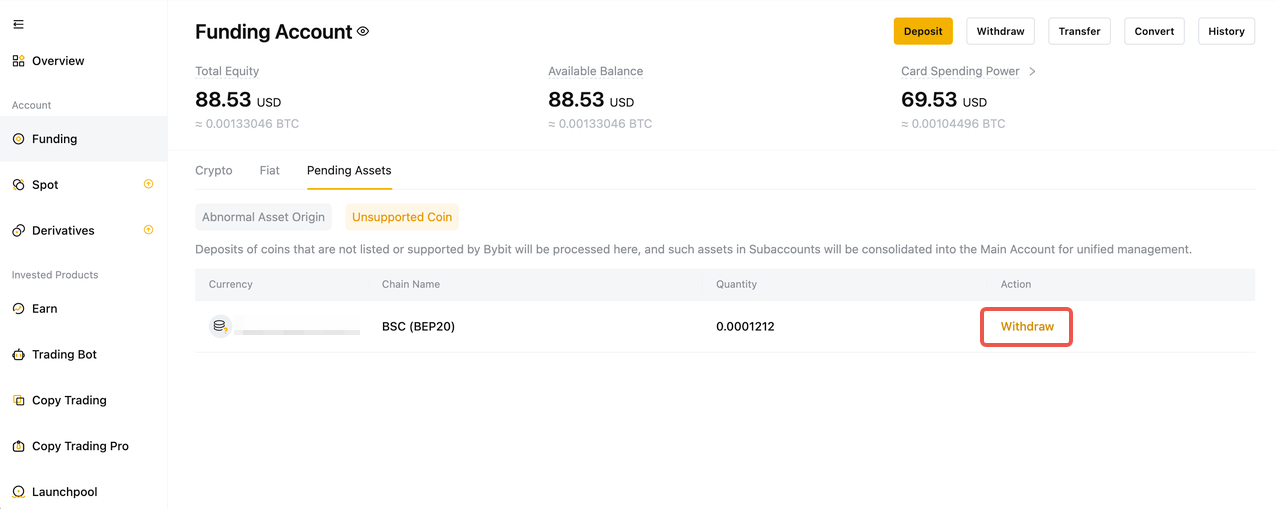 Note: A fixed handling fee in USDT for unsupported coin withdrawal will be deducted from your Funding Account. If you don’t have sufficient USDT in your Funding Account you can transfer from other accounts or make a deposit. For more information, please refer to How to Transfer Assets on Bybit or How to Make a Deposit.