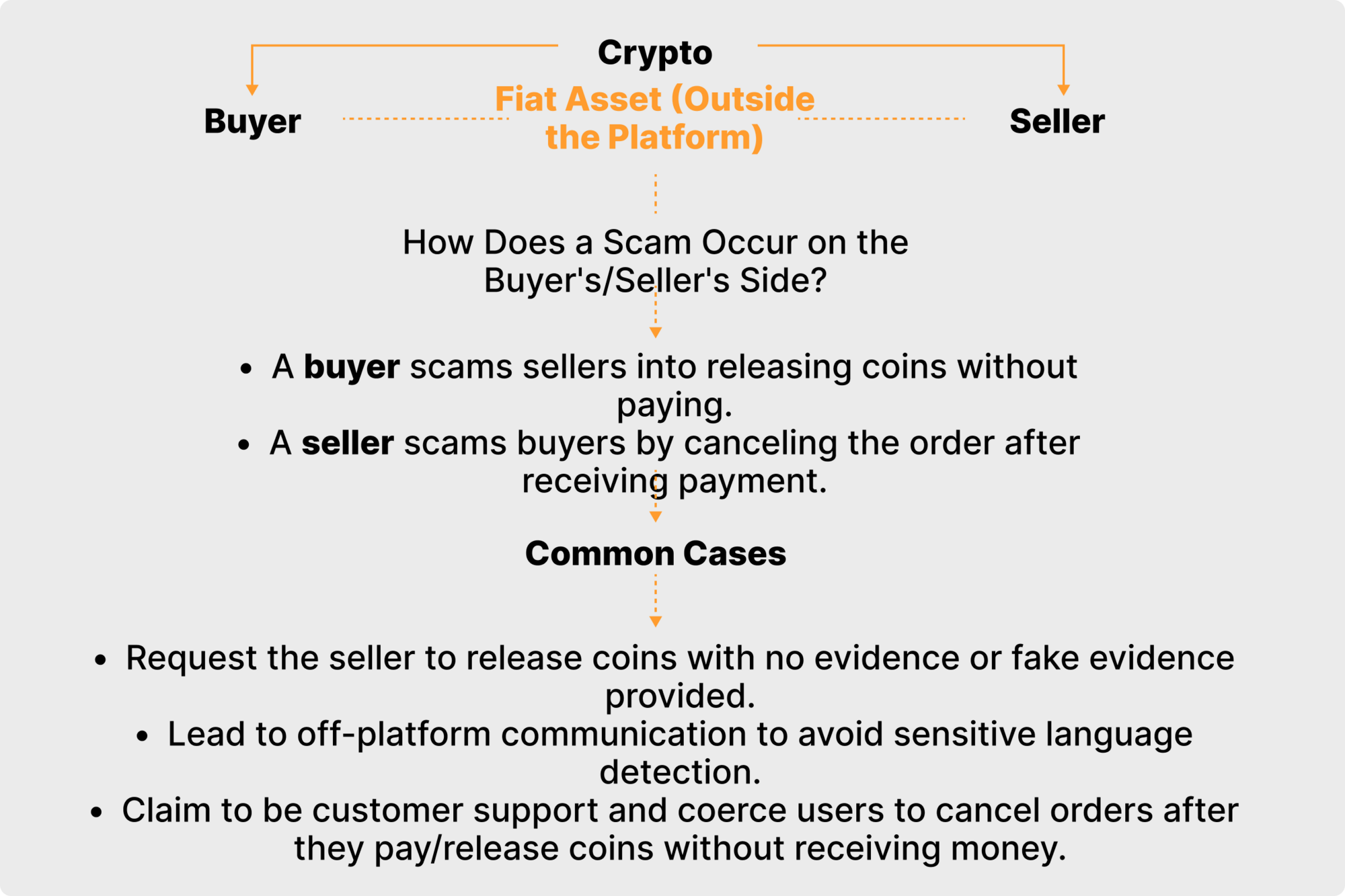 P2P crypto scams happen on peer-to-peer (P2P) exchanges connecting sellers and buyers, where the platform acts as an arbitrator with an escrow service for transfers. Scammers exploit this setup by bypassing the escrow system, deceiving buyers with false claims of non-receipt after payment, thus breaching the transaction. These scams capitalize on the inherent trust involved in P2P transactions, leaving unsuspecting users vulnerable to financial loss.