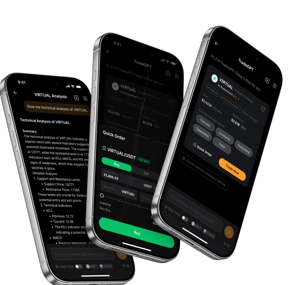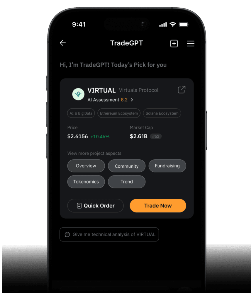 Search or ask TradeGPT about any token, and trade it instantly — no minimum required.