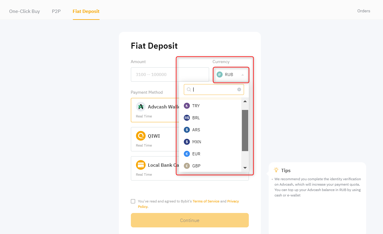 Puede consultar la lista de divisas admitidas para el depósito fiat accediendo a la página de depósito fiat y abriendo el menú de divisas que se muestra a continuación: