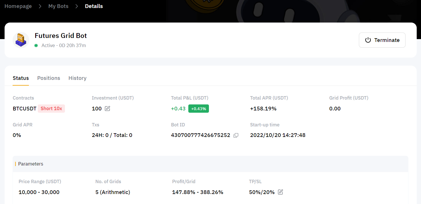 Las posiciones abiertas mantenidas por el Grid Bot de Futuros permanecerán abiertas si el precio de mercado cae fuera del rango de precios establecido y el Grid Bot no colocará ninguna orden nueva hasta que el precio vuelva al rango predefinido. Los usuarios tienen la opción de terminar los bots manualmente si así lo desean.