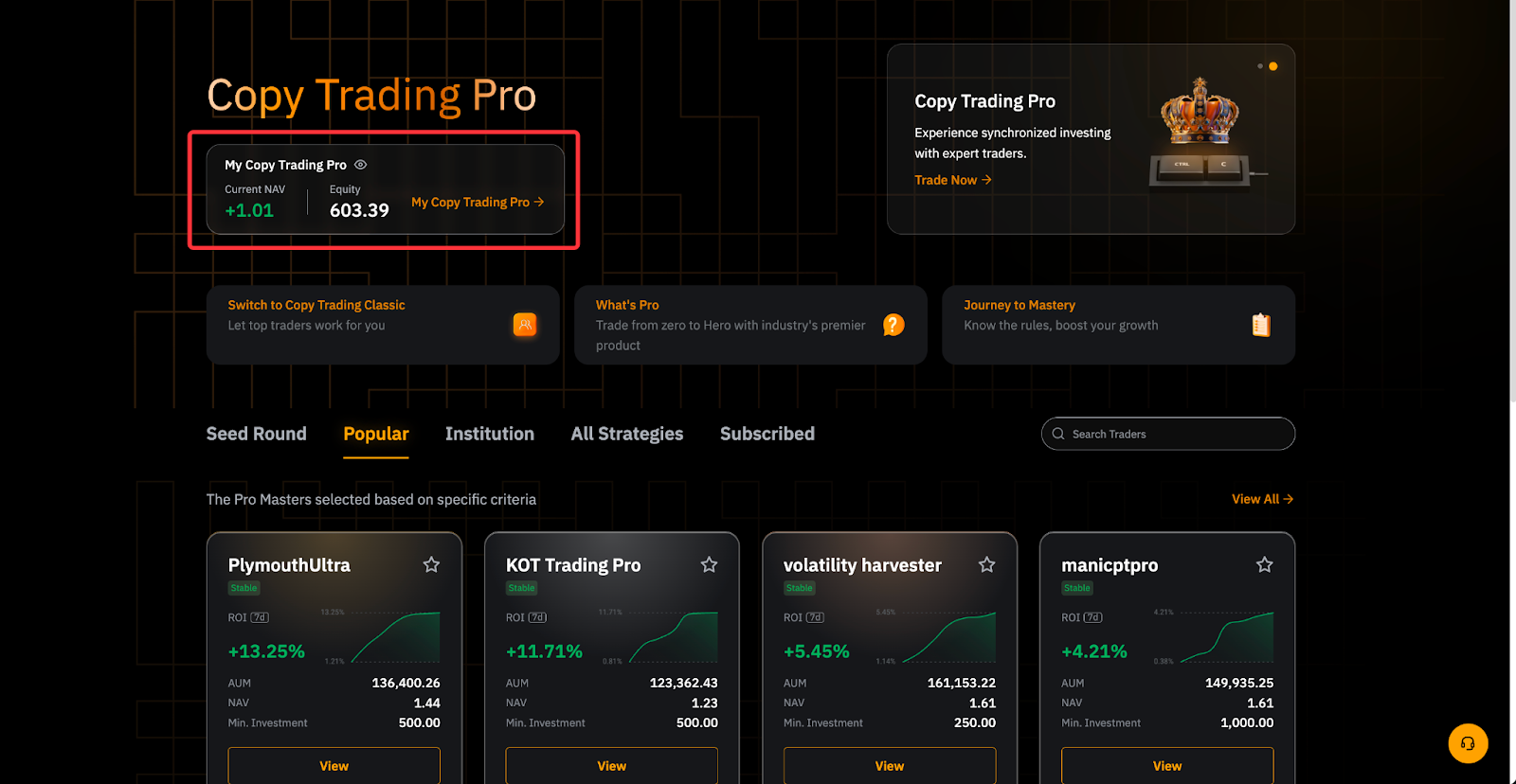 Para acceder a tu Centro Master Pro, cambia a tu Subcuenta Master Pro → Copy Trading Pro y haz clic en Mi tarjeta de Copy Trading Pro.