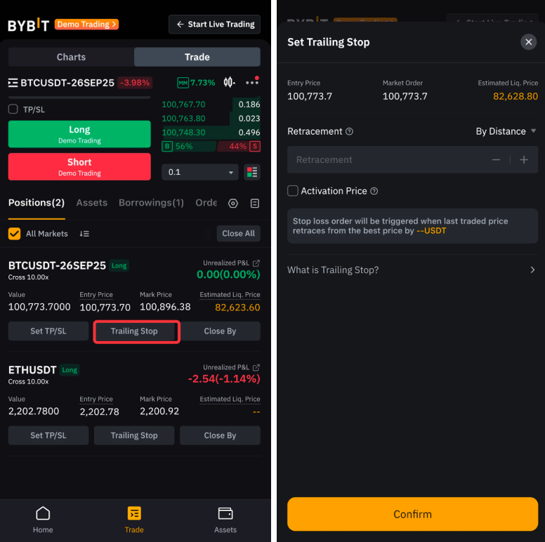 Una orden de Trailing Stop ajusta dinámicamente el precio de stop con los movimientos del mercado, lo que te ayuda a asegurar ganancias y al mismo tiempo limita el riesgo potencial a la baja. Para obtener más detalles, consulta la información sobre Órdenes de Trailing Stop (trading de perpetuos y de futuros).