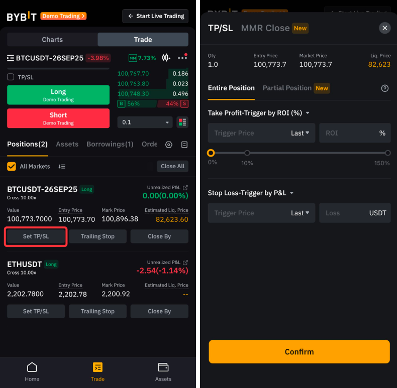Una orden TP/SL te permite establecer un precio objetivo para activar una orden de cierre para asegurar ganancias o limitar pérdidas. Para obtener más detalles, consulta el artículo Introducción a Take Profit y Stop Loss (contratos perpetuos y de futuros).