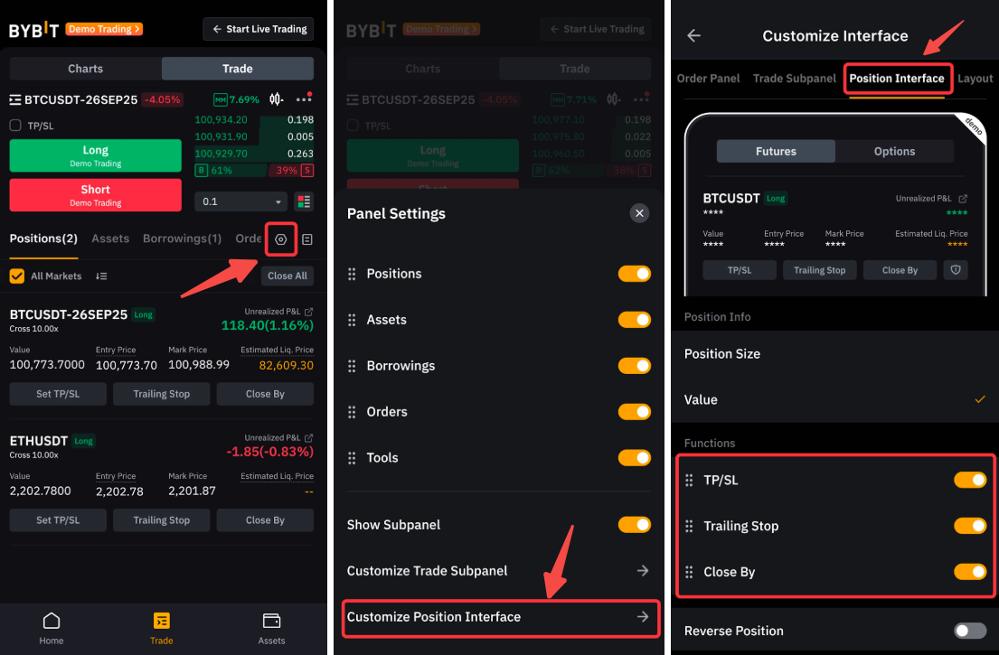 Ten en cuenta: Si no puedes encontrar ninguna de las órdenes de gestión de riesgos mencionadas anteriormente en la app, es posible que las hayas desactivado accidentalmente en la interfaz de posiciones. Para volver a activarlos, ve a Configuración de la interfaz de posiciones.