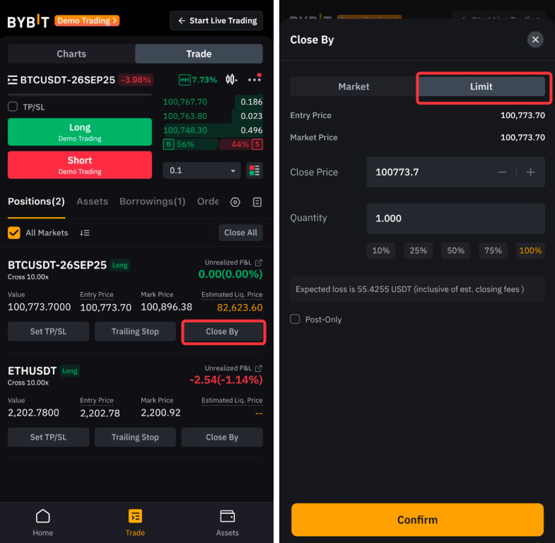 Ten en cuenta: Si la cantidad de la orden supera el tamaño de tu posición actual, se puede abrir una nueva posición en la dirección opuesta. Para evitar esto, puede activar la función de Sólo-Reducir para una orden con límite o Cerrar al activarse para una orden condicional.