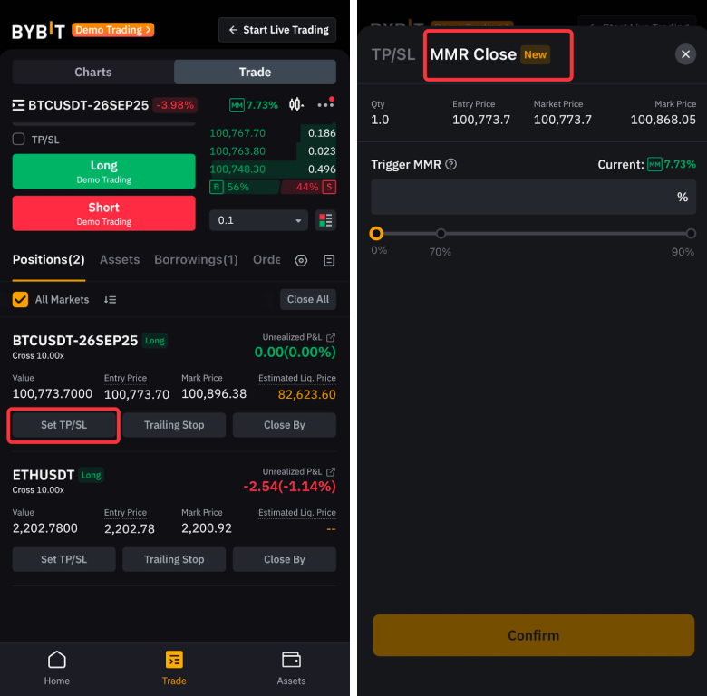 El Cierre por MMR colocará automáticamente una orden de mercado para cerrar por completo la posición seleccionada si la tasa de margen de mantenimiento (MMR) de tu cuenta alcanza el nivel de activación preestablecido. Para obtener más información, consulta la página de Orden de cierre por tasa de margen de mantenimiento (MMR).