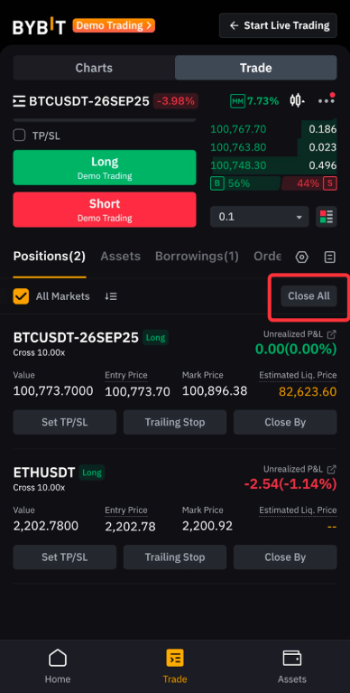 Utiliza el botón de Cerrar todo para salir de todas las posiciones abiertas en todos los mercados al precio de mercado.