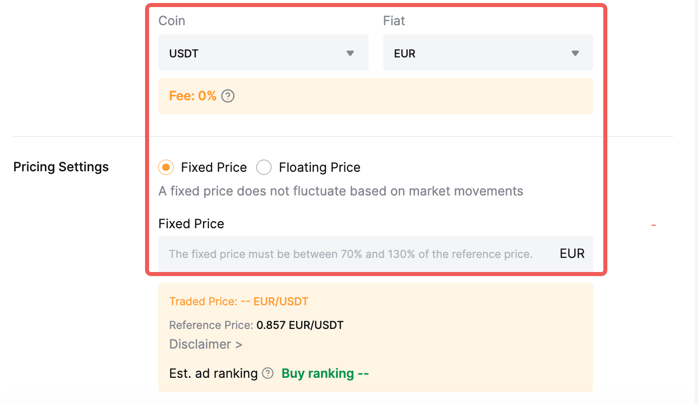 Actualmente, no se cobran cargos a los anunciantes por publicar anuncios. Sin embargo, tenga en cuenta que los usuarios están sujetos a cargos por transacción que pueden variar según la moneda del fiduciario, el método de pago, el nivel de anunciante o el tipo de anuncio. Consulte este artículo para ver las tarifas aplicables a P2P.