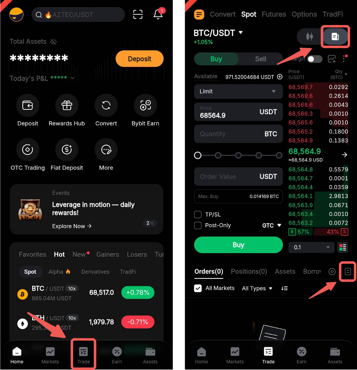 Di Aplikasi Bybit, buka Perdagangan → Spot dan alihkan tombol Perdagangan untuk mengakses Zona Pesanan. Ketuk ikon Riwayat Pesanan di sudut kanan atas tab Posisi untuk melihat riwayat pesanan dan riwayat perdagangan Anda.