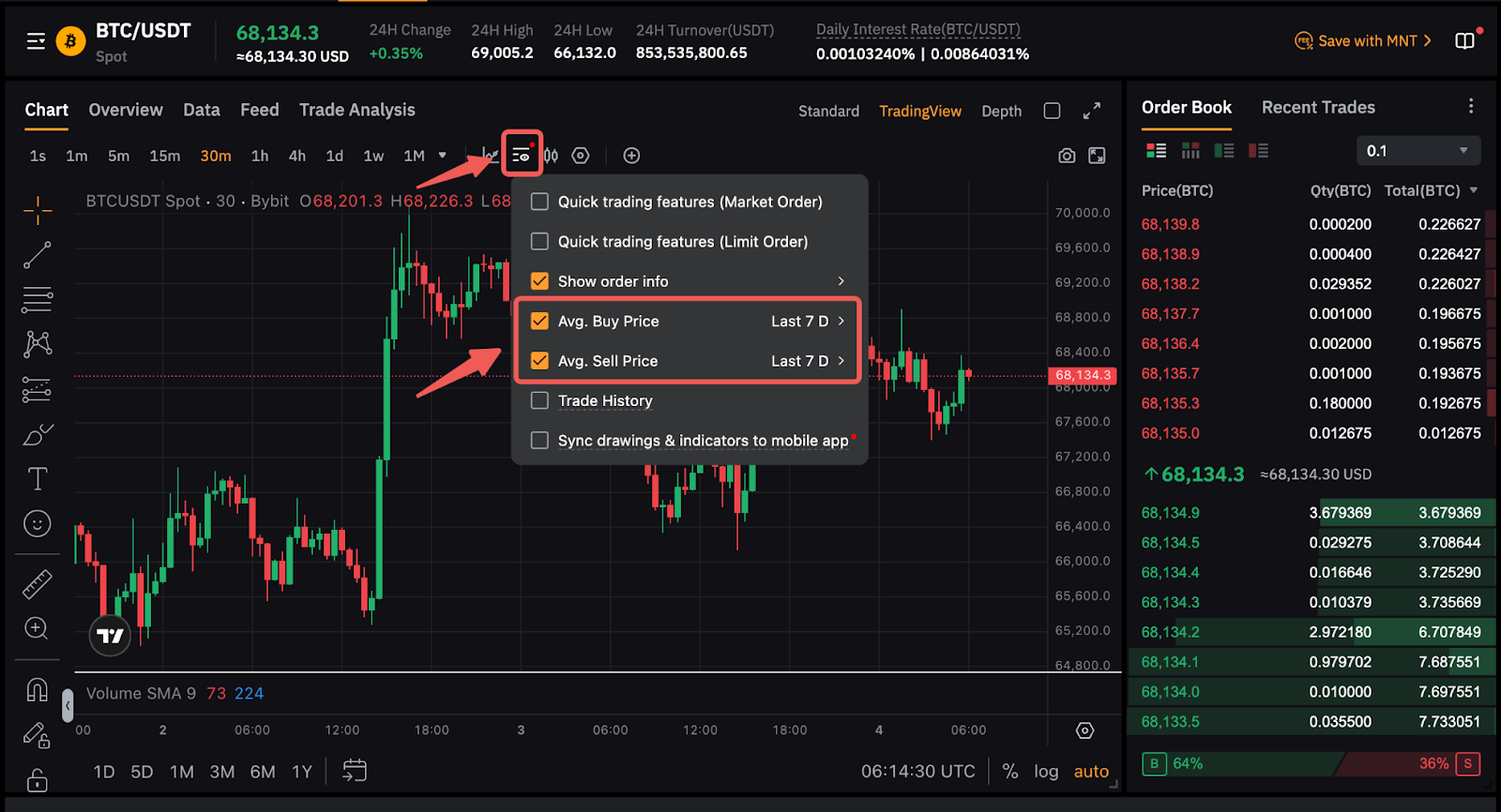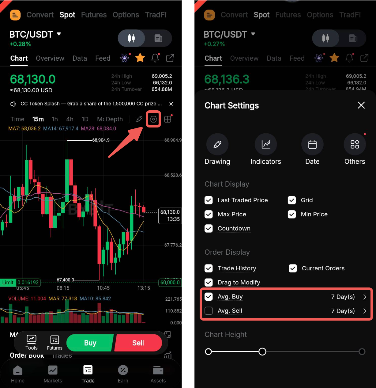 Saat melakukan perdagangan di Spot, Anda dapat menampilkan harga rata-rata order Jual dan Beli Anda secara langsung di grafik perdagangan. Untuk mengaktifkannya, klik ikon Tampilan dan centang harga rata-rata yang ingin Anda lihat. Anda juga dapat memilih periode yang akan dijadikan dasar perhitungan rata-rata (7, 30, 60, atau 90 hari terakhir). Harap diperhatikan bahwa harga rata-rata akan dihitung dari hari ini hingga hari terakhir dari periode yang dipilih.