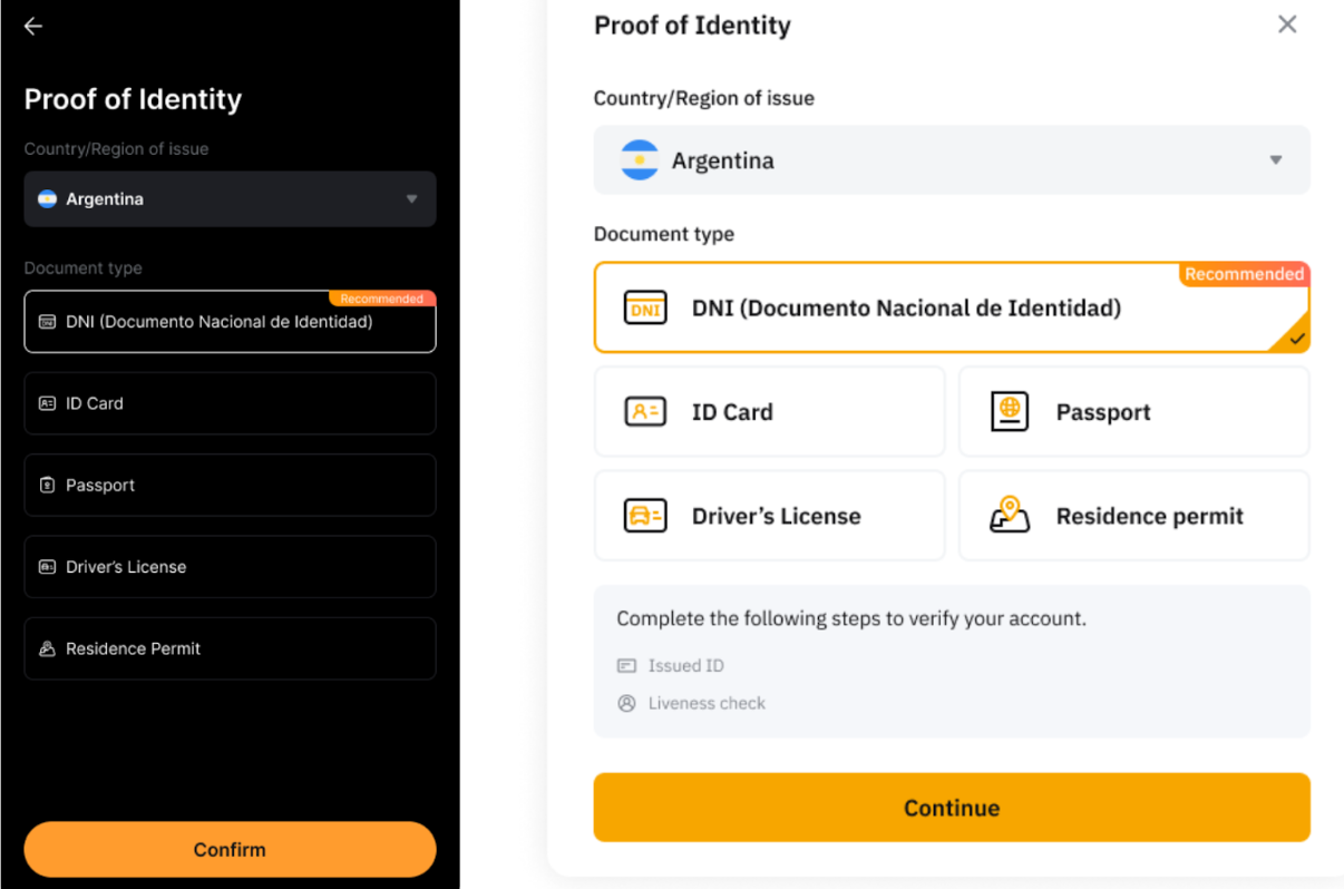 Penduduk Argentina dapat menyelesaikan verifikasi identitas menggunakan jenis dokumen lokal: DNI (Documento Nacional de Identidad).
