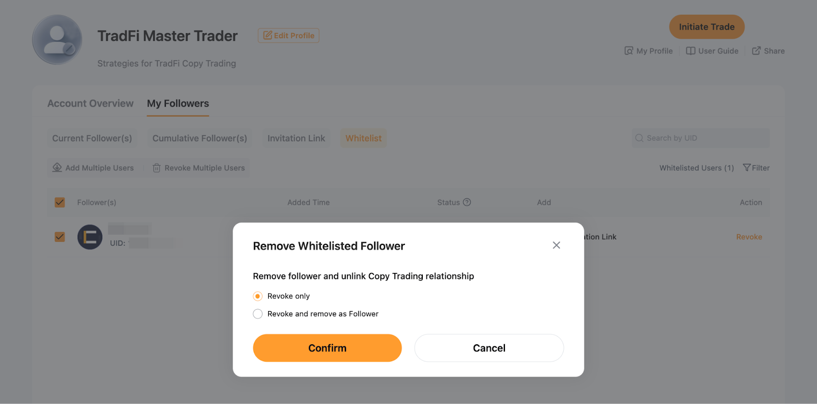 Setelah mengaktifkan fitur Daftar Putih Pengikut, Anda dapat menghapus Pengikut yang strategi perdagangan atau tujuan investasinya tidak lagi selaras dengan Anda. Hal ini memungkinkan Anda untuk mengelola basis Pengikut dengan lebih baik dan memastikan strategi Anda dibagikan kepada audiens yang tepat.