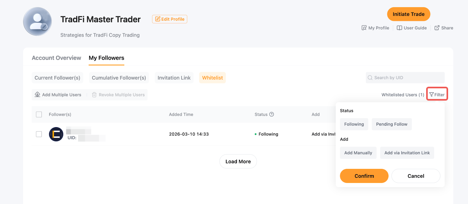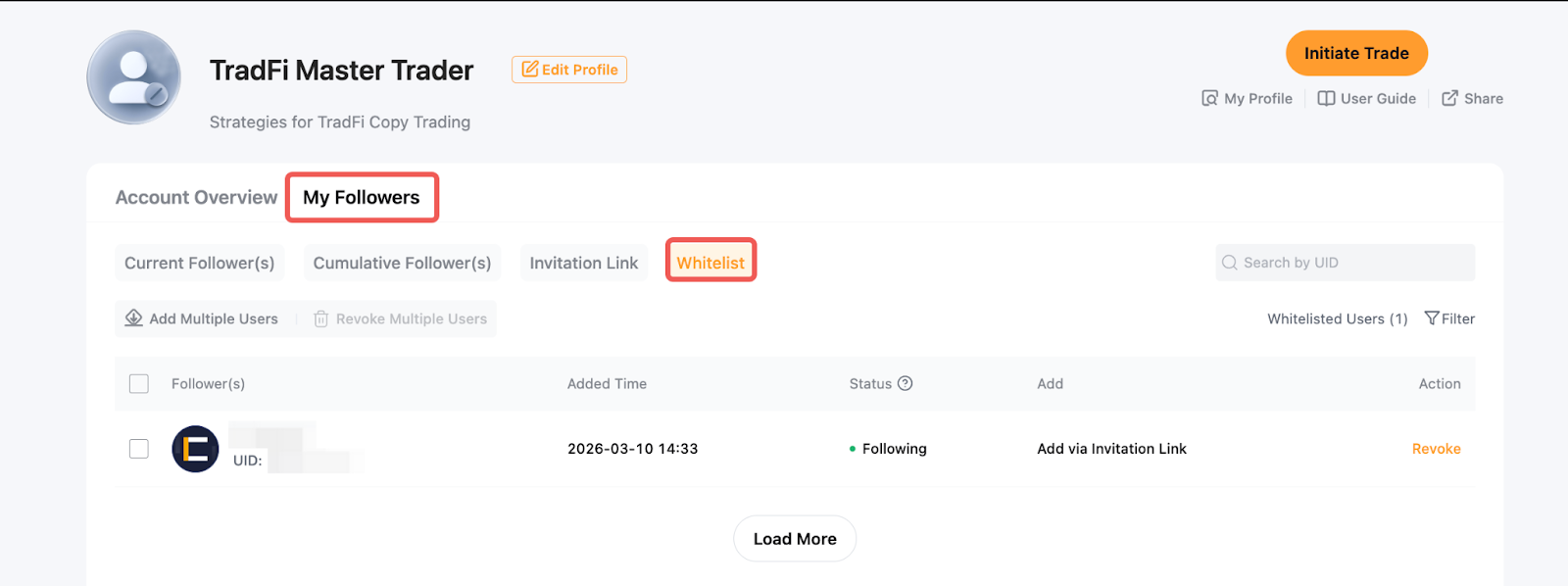 Copy Trading TradFi menyediakan dua fitur — Tautan Undangan dan Daftar Putih Pengikut — yang memungkinkan Master Trader untuk mengelola siapa saja yang dapat mengikuti perdagangan mereka.