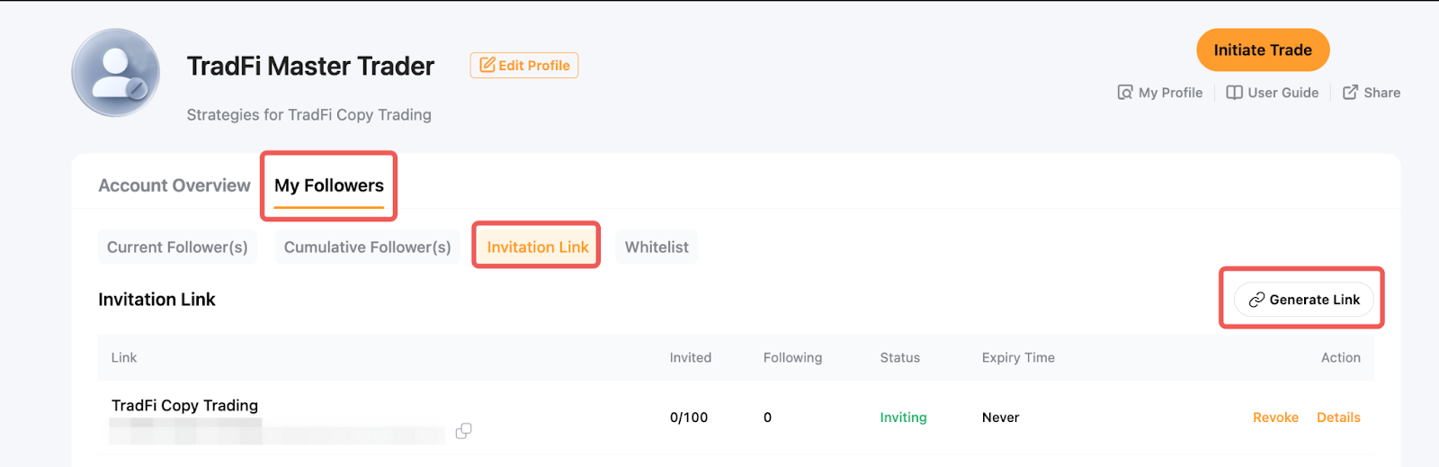 Langkah 1: Untuk membuat tautan undangan, buka Pusat Pengguna (Master Trader) → Pengikut Saya → Undangan, lalu klik Buat Tautan.
