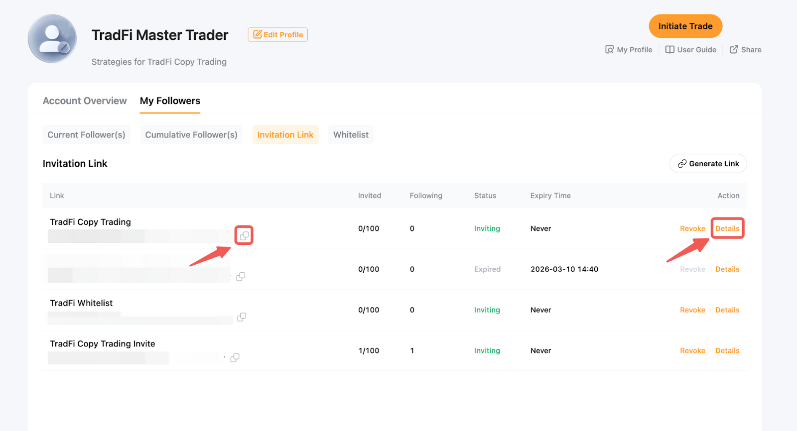 Sebagai Master Trader, Anda dapat membuat tautan undangan unik yang memungkinkan Pengikut untuk menyalin perdagangan Anda secara langsung tanpa konfirmasi tambahan. Jika Daftar Putih Pengikut diaktifkan, Pengikut yang bergabung melalui tautan undangan akan secara otomatis ditambahkan ke daftar putih.