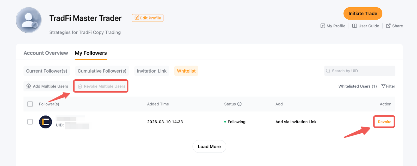 Langkah 1: Untuk menghapus Pengikut dari daftar putih Anda, buka Pusat Pengguna (Master Trader) dan klik Pengikut Saya → Daftar Putih → Cabut.