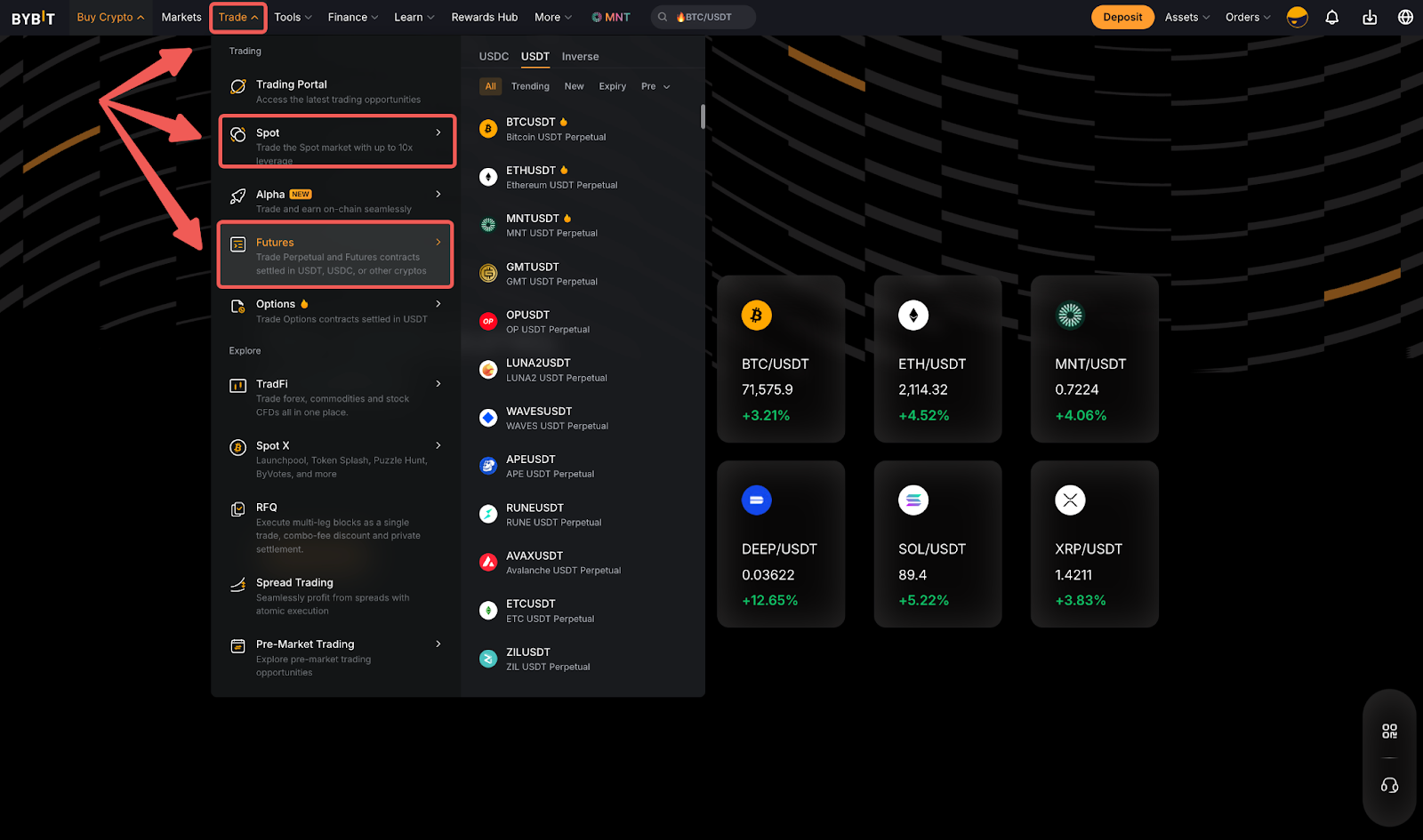 Langkah 1: Di beranda Bybit, buka menu tarik-turun Perdagangan dan pilih perdagangan Spot atau Futures. Kemudian, pilih kontrak yang ingin Anda perdagangkan.